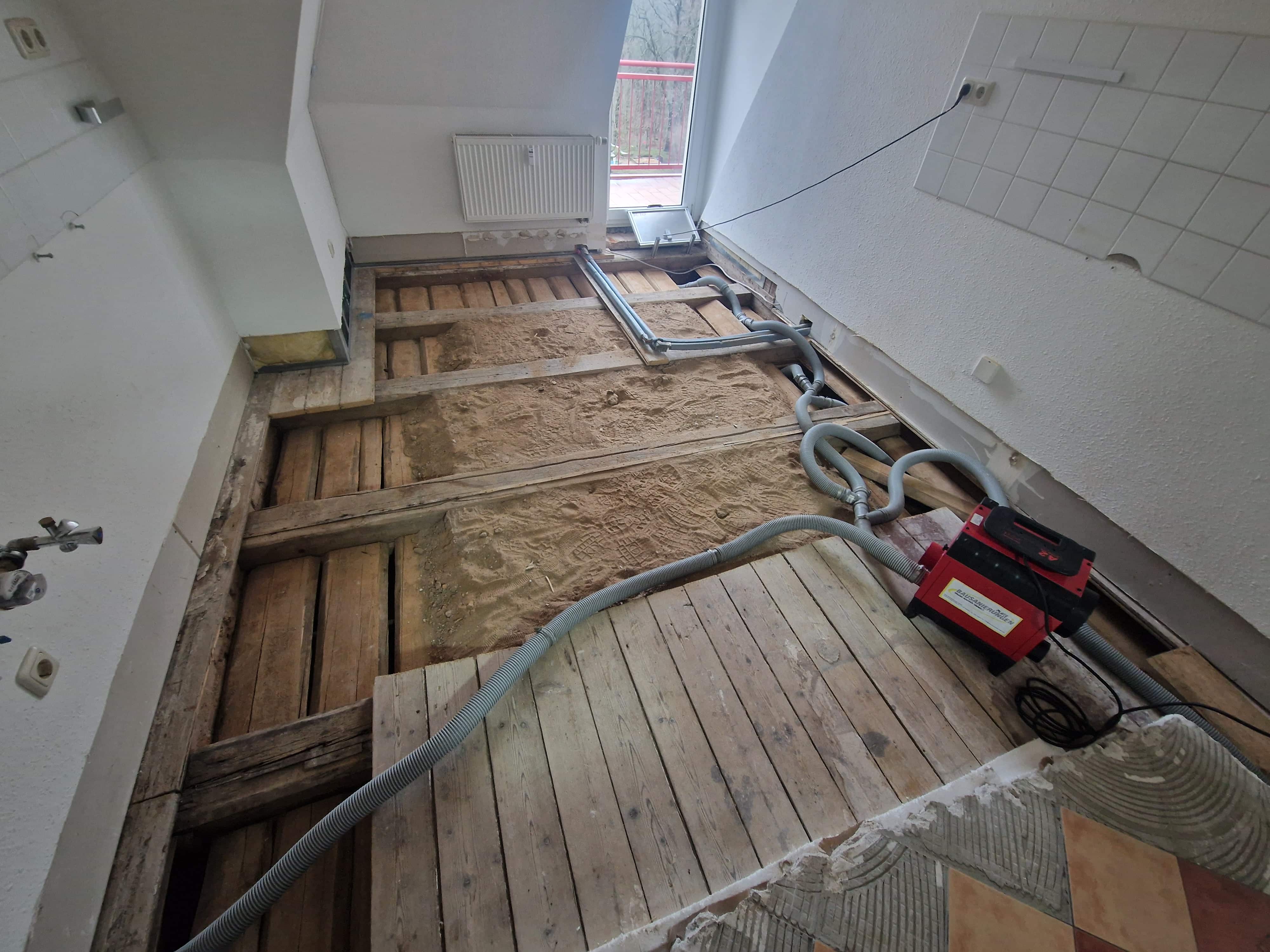 - Großflächige Wasserschäden im Fußboden (Holzbalkendecke mit Sandauffüllung)
